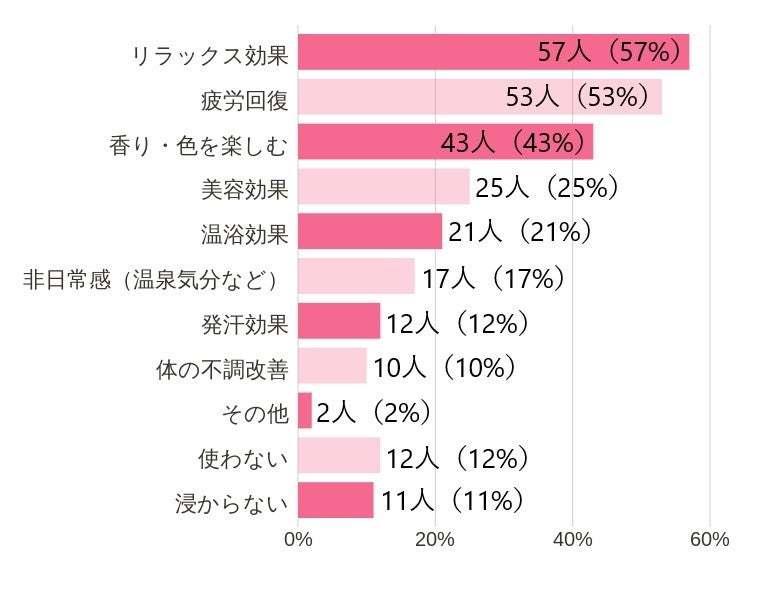 一方で使う理由としては、リラックス効果・疲労回復・香り・色が上位に挙がりました。そして“使わない”という回答は12%に留まっています。