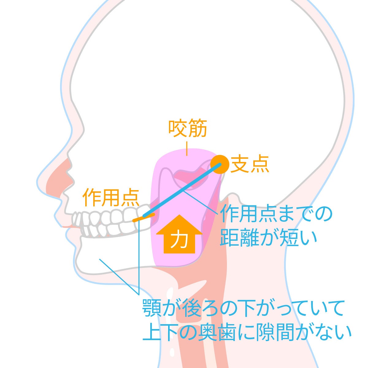 通常の食いしばりの場合は上下の奥歯で食いしばります。しかし、タンピローを装着すると、下の前歯が前方に誘導されますので、下の顎が前に突き出ます。そうすると、上下の奥歯はあたることさえ出来なくなります。奥歯で食いしばることが出来なくなるのです。