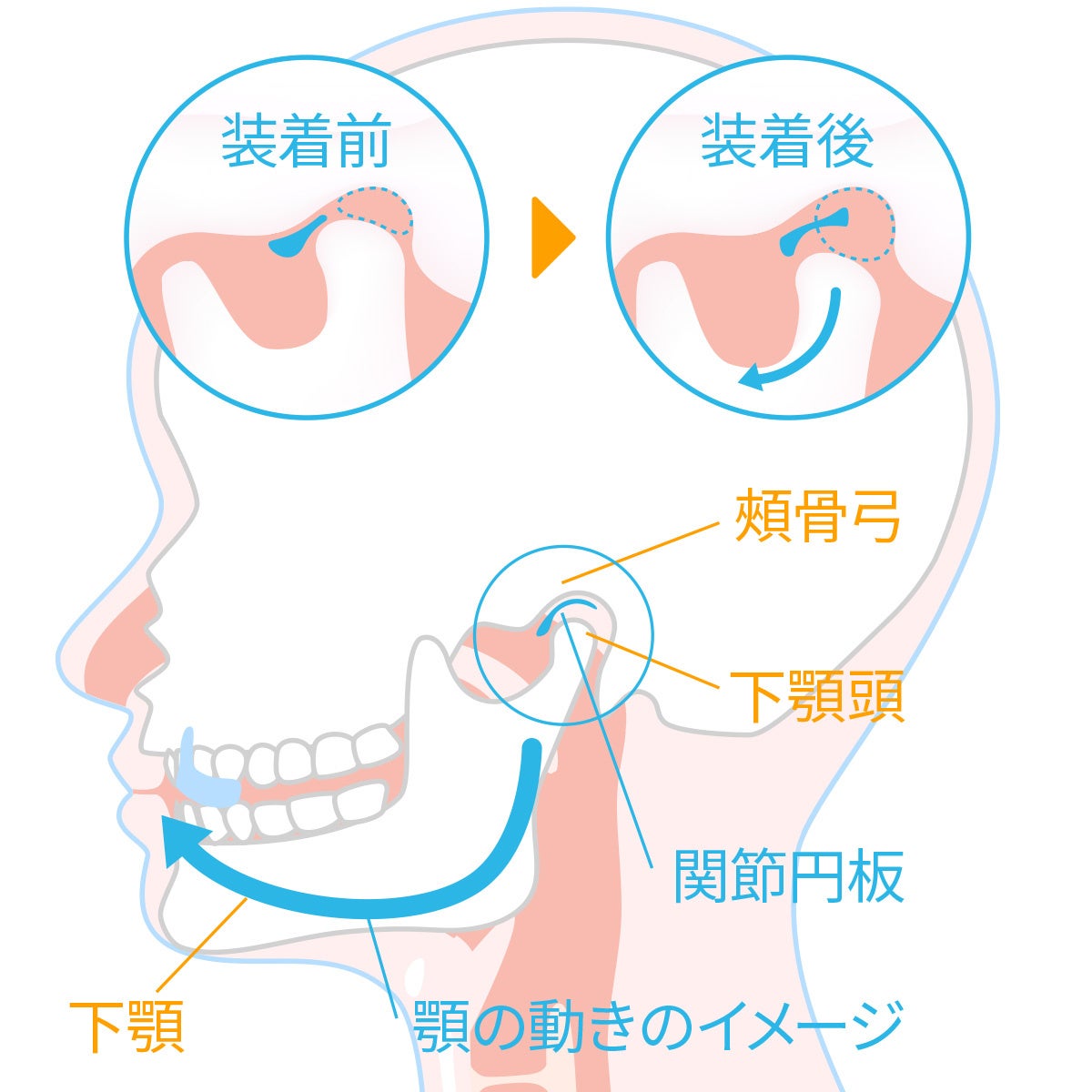 タンピローを装着し噛もうとして動かすと下の前歯がタンピローに接触し、前上方に下顎が誘導されます。そうすると下顎頭が前下方に回転しながら誘導されますので、顎関節の関節円板がある関節腔内のエリアに余裕ができます。
