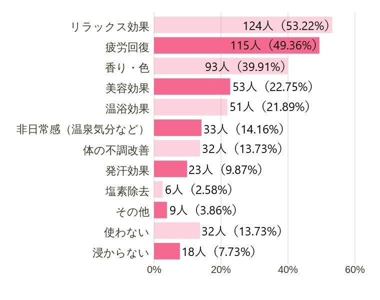 一方で使う理由としてはリラックス効果・疲労回復・香り・色が上位に挙がりました。”使わない”という回答は約14%にとどまっています。