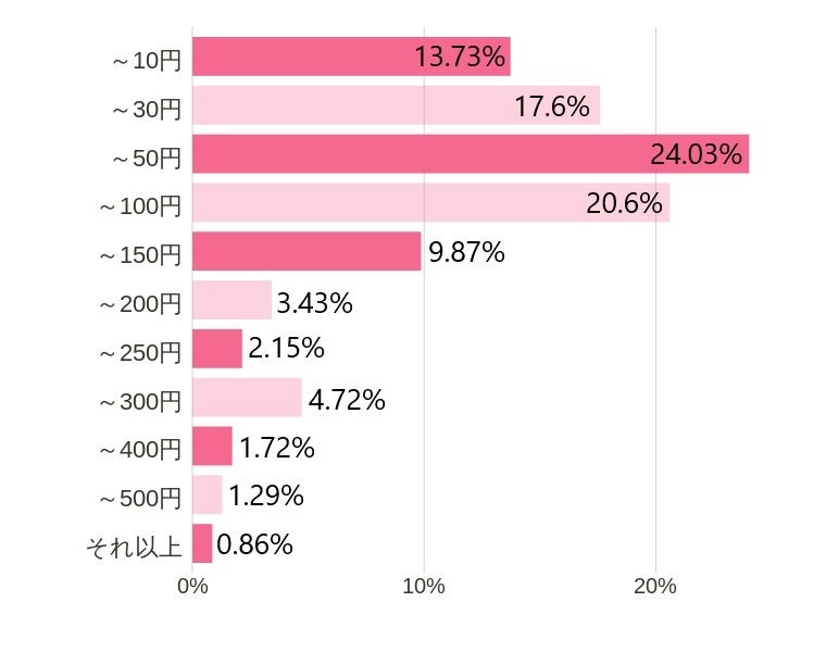 普段使いの価格帯としては、~50円との回答が24%でトップに。続いて、~100円が20.6%、~30円が17.6%という順になりました。