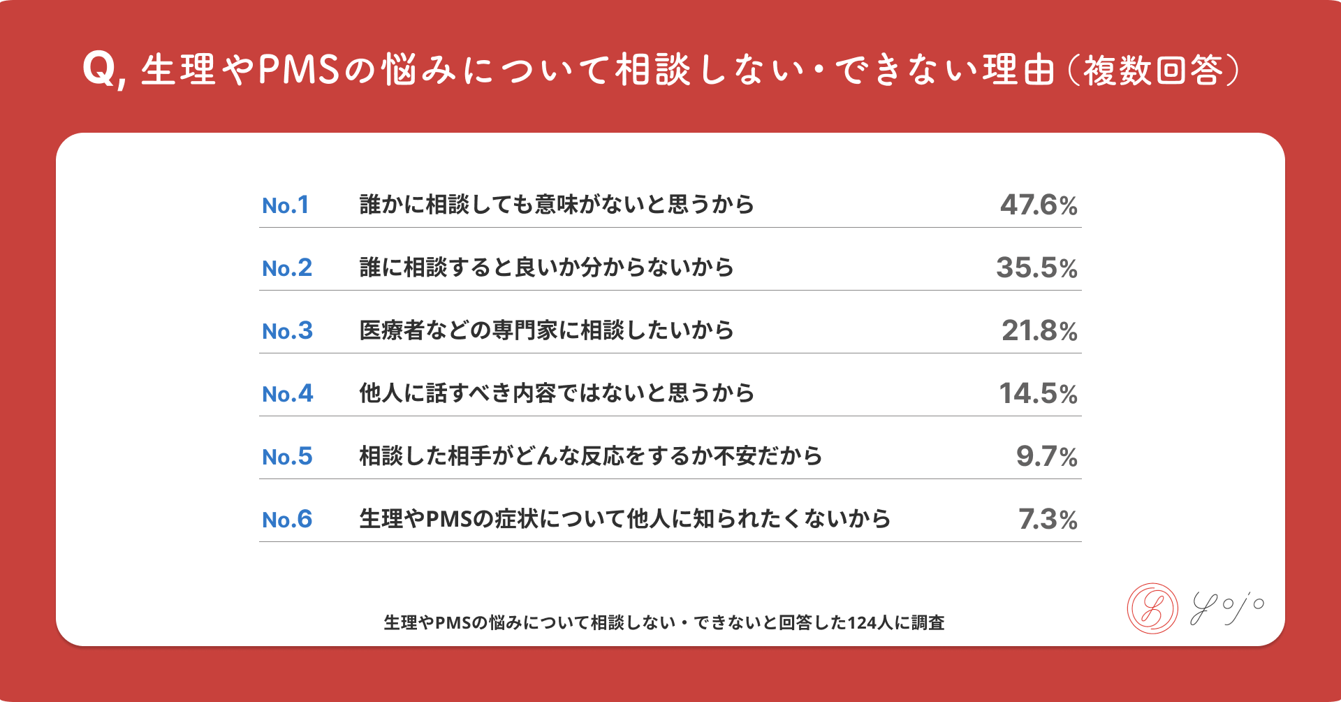5.忙しくて時間がなかったから(27.0%)生理前のみの症状であるため、受診するほどでもない、仕方がないと自身のケアを後回しにしていることがわかる。