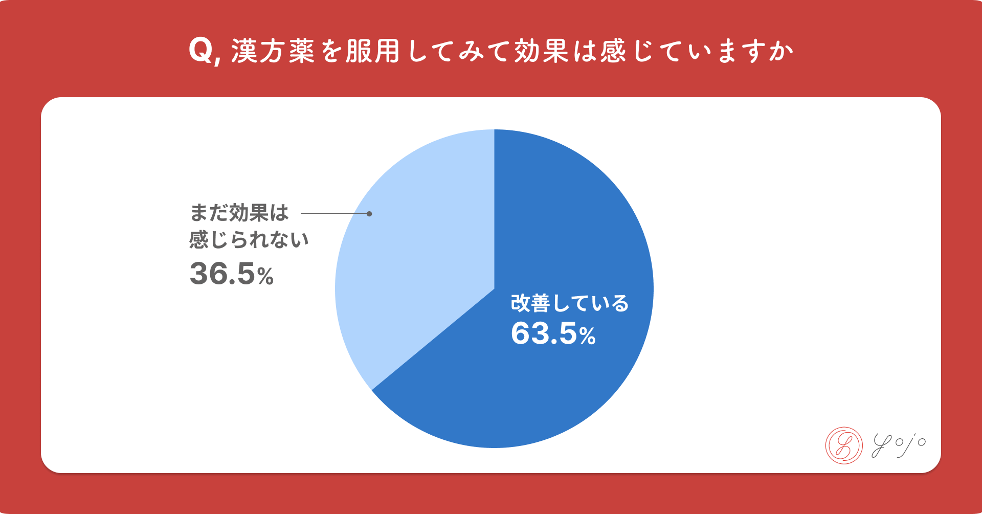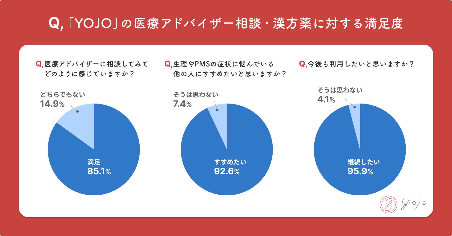 生理・PMSの悩みを主訴とする63.5%の人が、『YOJO』の医療アドバイザーが提案した「漢方薬」を服用し、月経前の「イライラ」「不安」「情緒不安定」といった精神的症状だけでなく、「便秘」「頭痛」などの身体的症状に対しても改善したと回答。生理やPMSの症状は一時的であるため仕方がないとあきらめる前に、気軽に医療アドバイザーに相談し、漢方薬をはじめとしたケアを始めることで悩みを軽減できることがわかる。
