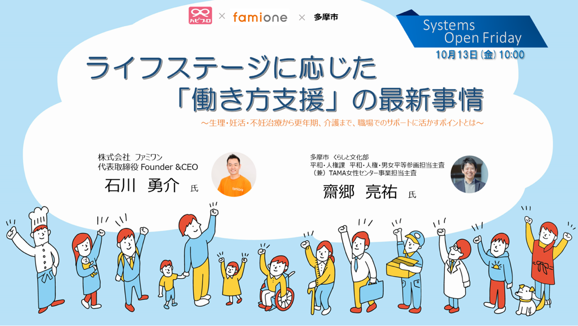 「子どもを願うすべての人によりそい 幸せな人生を歩める社会をつくる」をビジョンに掲げ、LINEを活用した妊活コンシェルジュサービス「famione(ファミワン)」 https://lp.famione.com/ を提供する株式会社ファミワン(本社:東京都渋谷区、代表取締役:石川勇介、以下当社)の代表石川は、東京海上日動システムズ株式会社(東京都多摩市、代表者取締役社長:関邦夫、以下東京海上日動システムズ) の全社員を対象にした「ライフステージに応じた『働き方支援』の最新事情 〜生理・妊活・不妊治療から更年期、介護まで、職場でのサポートに活かすポイントとは〜」と題したセミナーに登壇します。