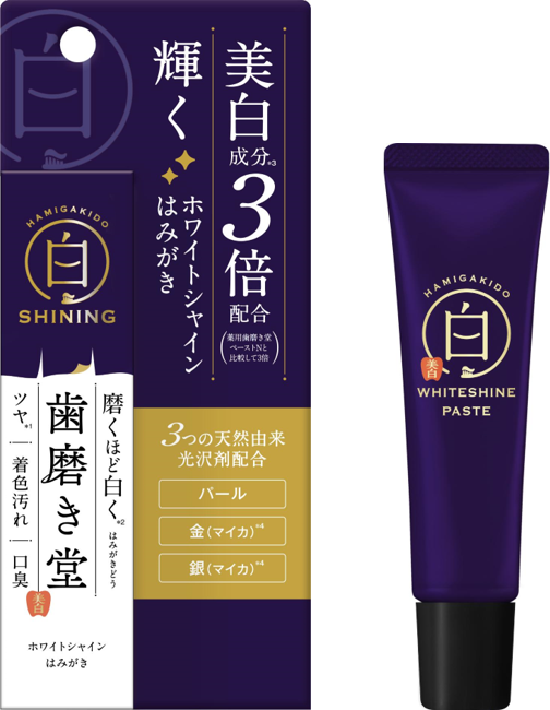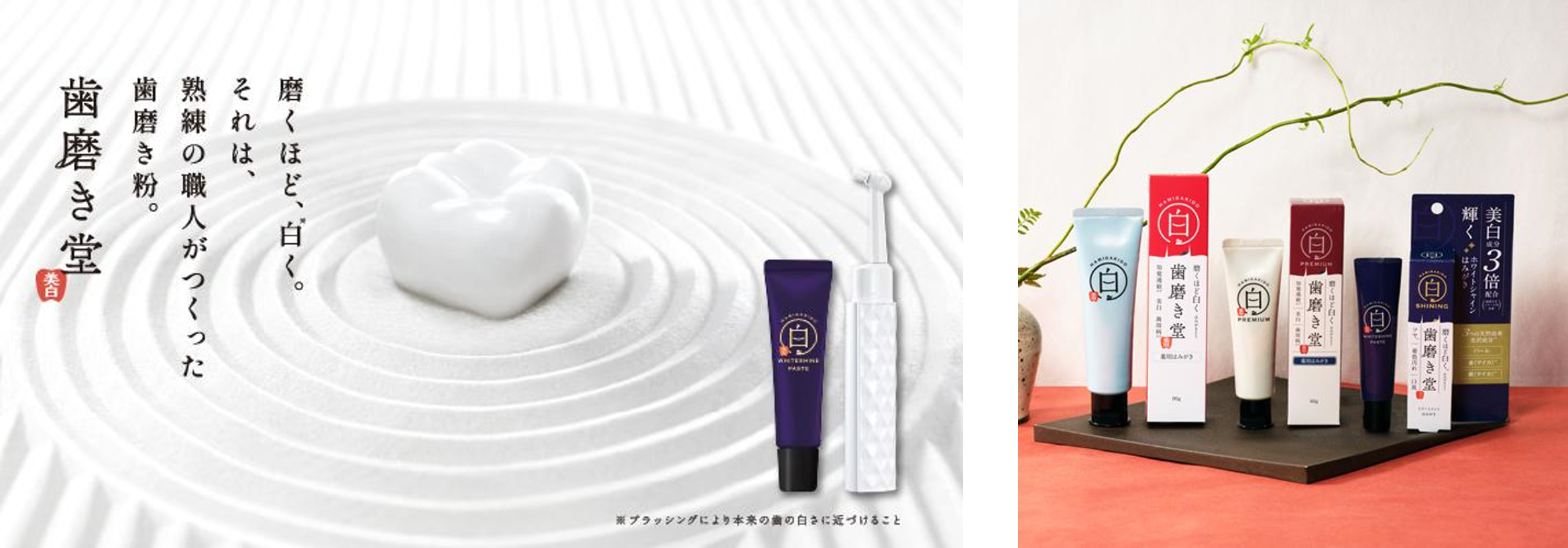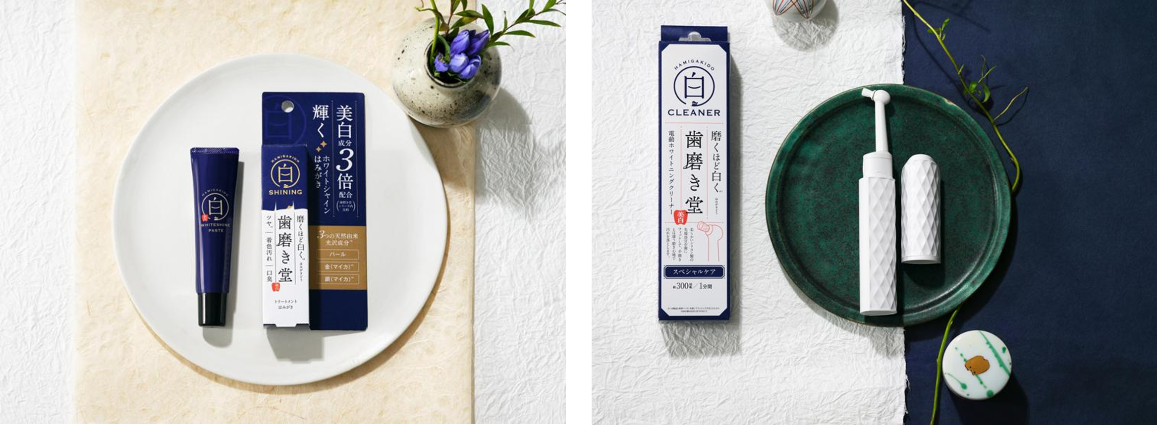 「歯磨き堂」は、30年以上オーラルケアを研究し続けた歯科専門家をはじめ、研究・開発・製造の分野の職人の知が集結した本格ホワイトニングケアブランドです。今回の新商品「ホワイトシャインペースト」と「電動ホワイトニングクリーナー」は、”歯磨きでは落としきれない着色汚れを除去したい”、”仕上げにもっと歯のツヤを出したい”という方に向けて、スペシャルケアを自宅で気軽に取り入れて欲しい、という思いから誕生しました。