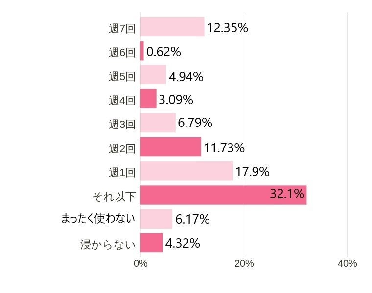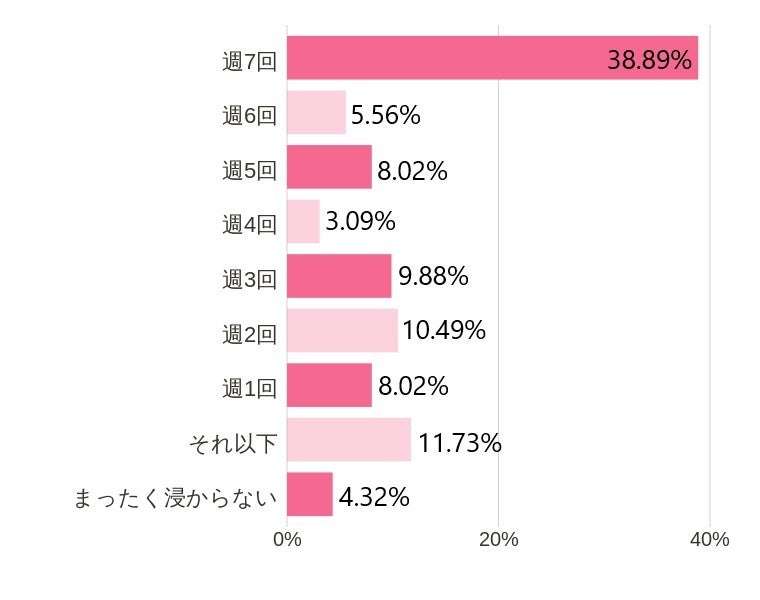 調査によると、40代女性のうち毎日(週7回)入浴は4割弱という結果に。毎日入浴のかたは過半数とはならなかったものの、週4~7回(週の半数以上)入浴するというかたは55.56%と高い割合となりました。週1未満・全く浸からないというかたは16.05%で、8割以上のかたは最低でも週1以上はお風呂に浸かっていることがわかります。
