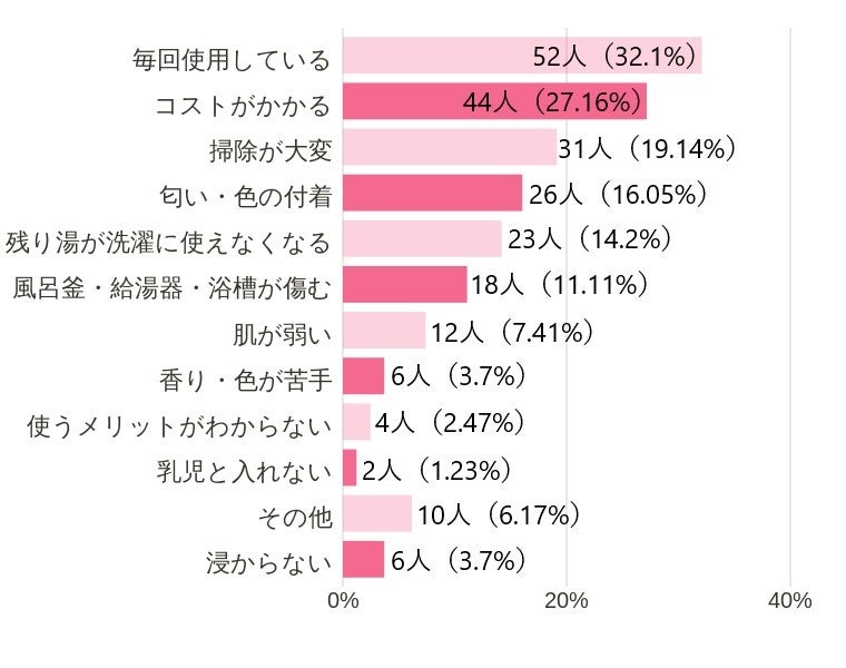 コスト以外の理由として上位に挙がっているのが、掃除が大変、匂いや色の付着、残り湯が洗濯に使えなくなるといった、どれも家事に関わる内容でした。