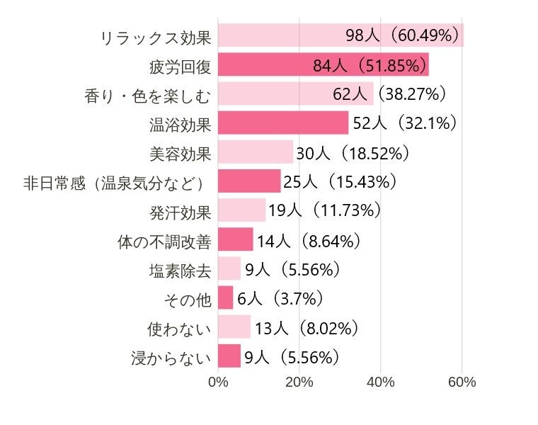 入浴剤に求める効果としては、リラックスや疲労回復と合わせ、香りも重要視していることがわかりました。このことは、自由回答にあった「香りの変わるもの」「食べ物のにおいがするもの」といった内容からも伺えます。