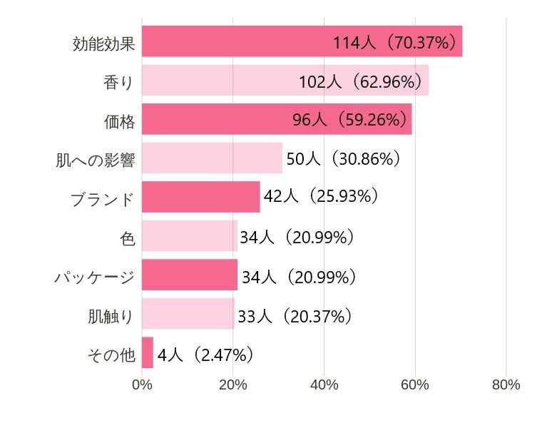 使う理由としてはリラックスや疲労回復といった効果を求める声が非常に高いことが伺えます。香り・色に関しては使う理由としては38%と過半数を割っていますが、選ぶ際のポイントとしては“香り”を挙げているかたが約63%も見られます。ただし、色に関しては20.99%ということで、香りとの差を大きく開けており、40代女性の多くは、色よりも香りをより重視して選んでいることがわかります。