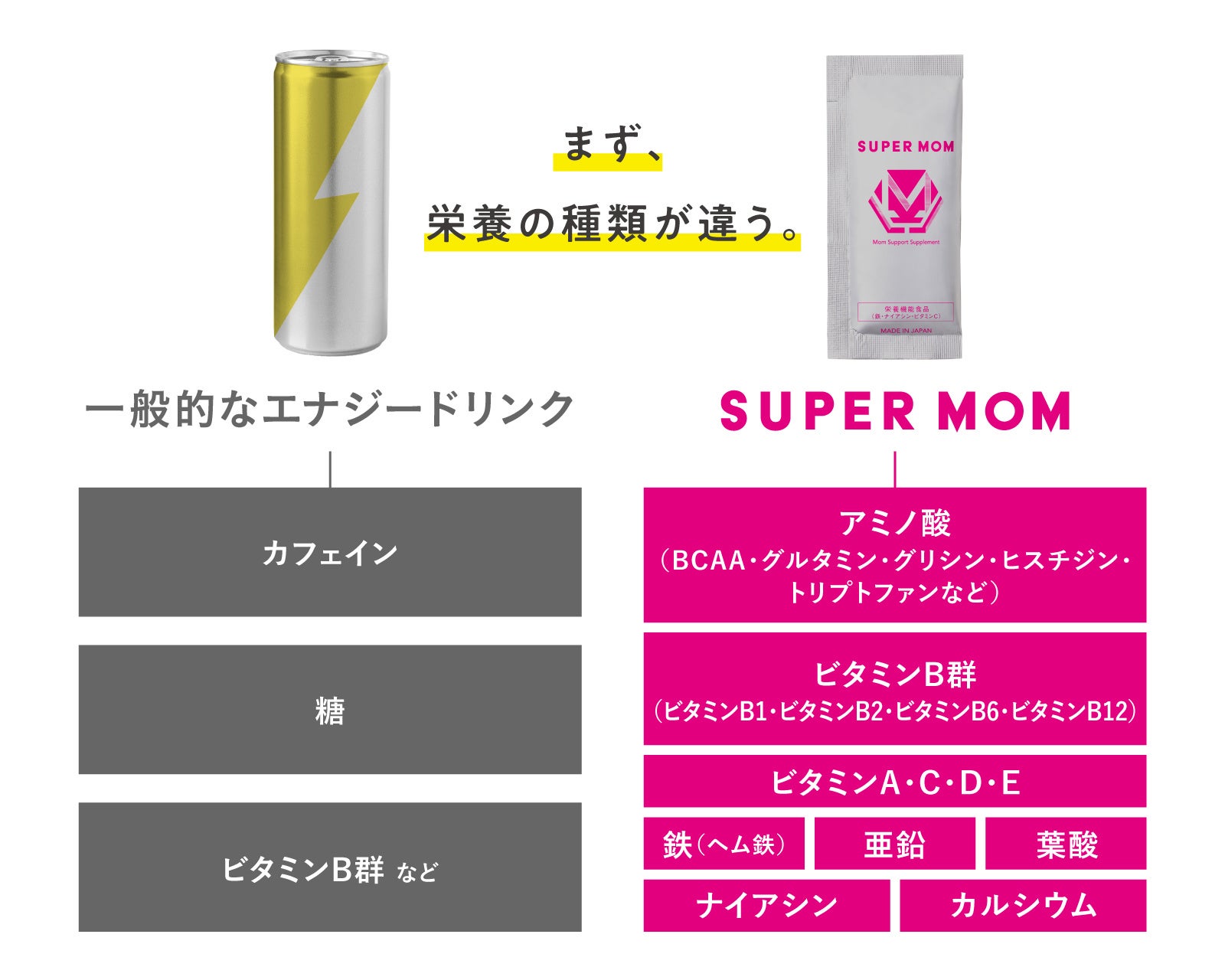 一般的なエナジードリンクのエネルギー源が「カフェイン」や「糖」であるのに対し、スーパーマムは「アミノ酸」を中心に配合し、続けるほど、元気がつづく栄養設計を実現。