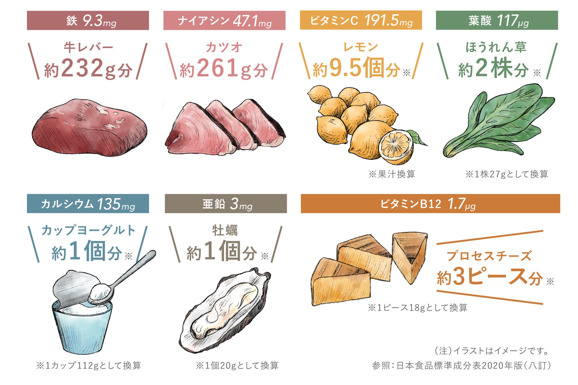 ●産後・育児中のママに特に必要な「ビタミンC・鉄・ナイアシン・カルシウム・亜鉛・葉酸」など、豊富なビタミン・ミネラルをバランスよく配合。