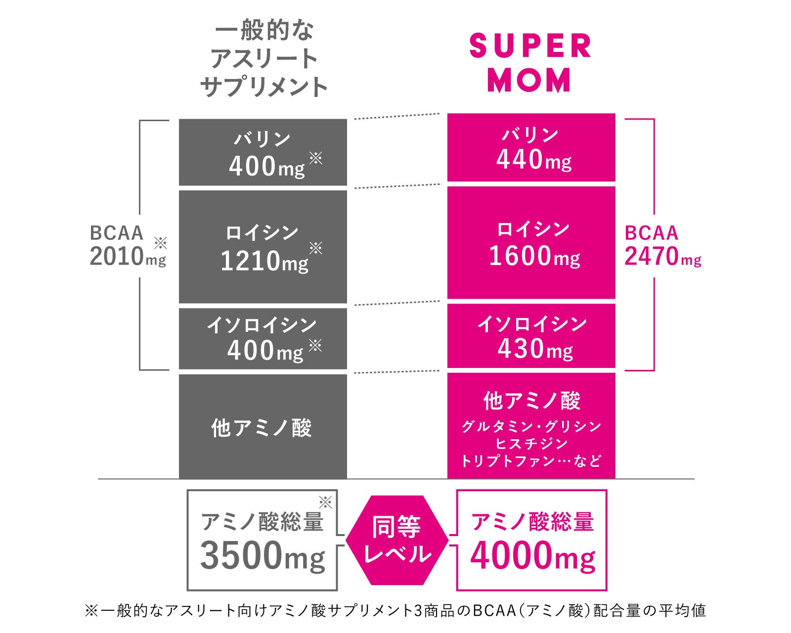 ※BCAAの配合量。他社ママ向けサプリメント3商品の平均値と比較。(自社調べ/2023年9月6日時点の数値)
