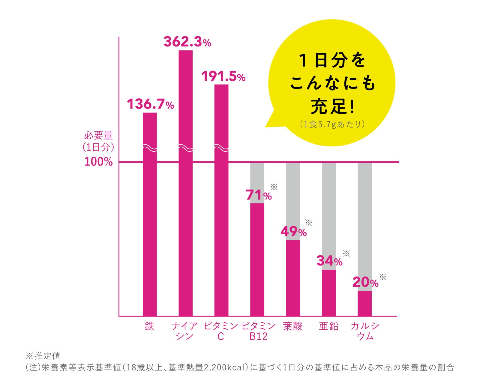 ※葉酸、ビタミンB12、カルシウム、亜鉛、アミノ酸(バリン、ロイシン、イソロイシン、他アミノ酸):推定値