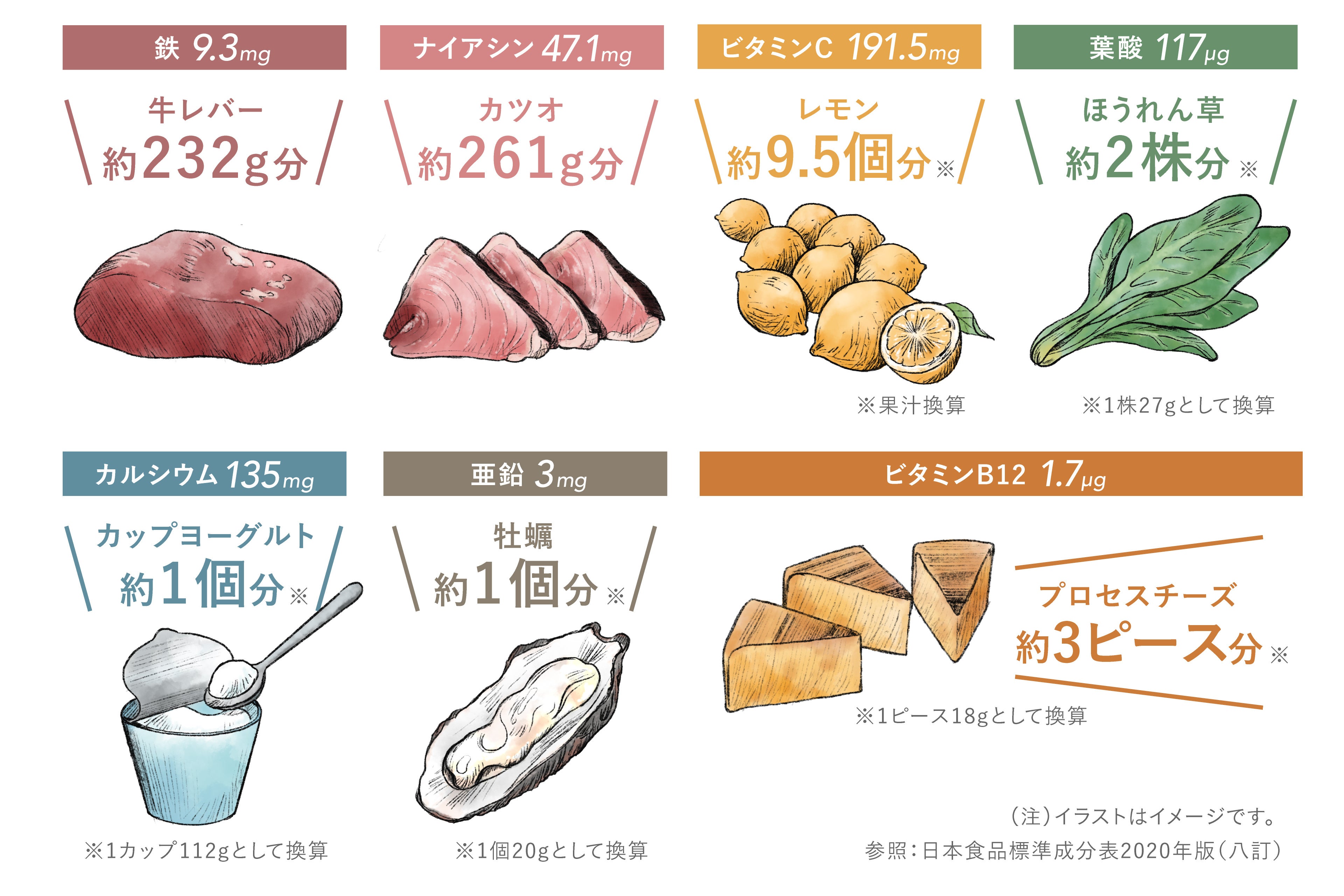 これだけの食品と同じ栄養がたった1包で摂取可能に。
