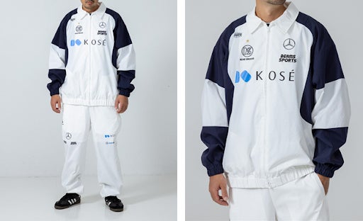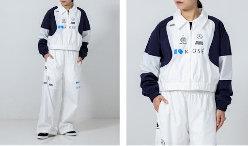 ステージに映えるホワイトカラーをベースに、ネイビーと掛け合わせた都会的で洗練されたイメージでデザインしました。ほつれや破れに強い、ドビーリップストップナイロンポリを採用し、ブレイキン(ブレイクダンス)のアクティブな動きにも対応する機能性も兼ね備えています。ダンスの動きがより際立つよう、袖のカラー配分や、パンツの太さなどの細部にもこだわり、ブレイキンのダイナミックなイメージの中にも、品をプラスするようなセットアップで、新たな表情を演出します。