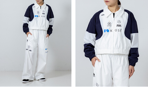 ステージに映えるホワイトカラーをベースに、ネイビーと掛け合わせた都会的で洗練されたイメージでデザインしました。ほつれや破れに強い、ドビーリップストップナイロンポリを採用し、ブレイキン(ブレイクダンス)のアクティブな動きにも対応する機能性も兼ね備えています。ダンスの動きがより際立つよう、袖のカラー配分や、パンツの太さなどの細部にもこだわり、ブレイキンのダイナミックなイメージの中にも、品をプラスするようなセットアップで、新たな表情を演出します。