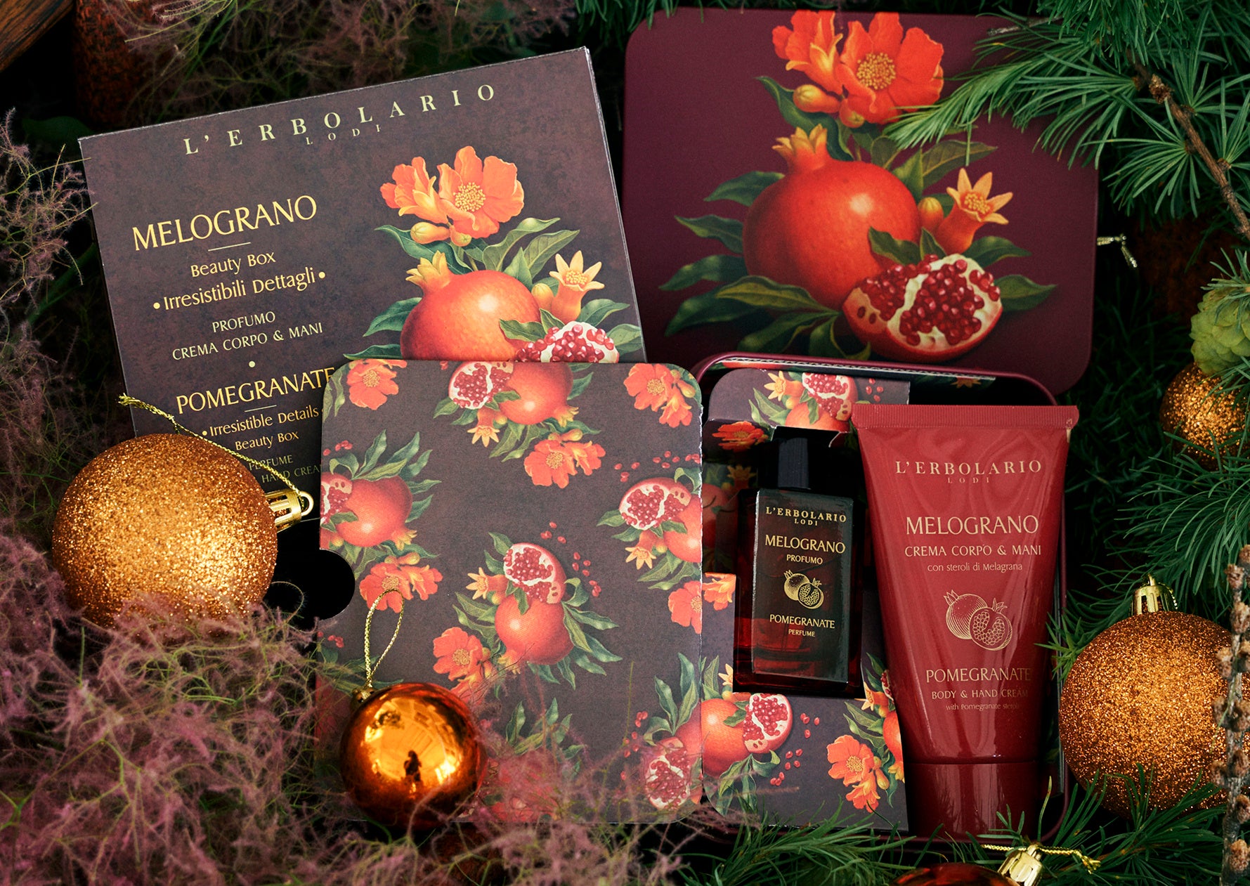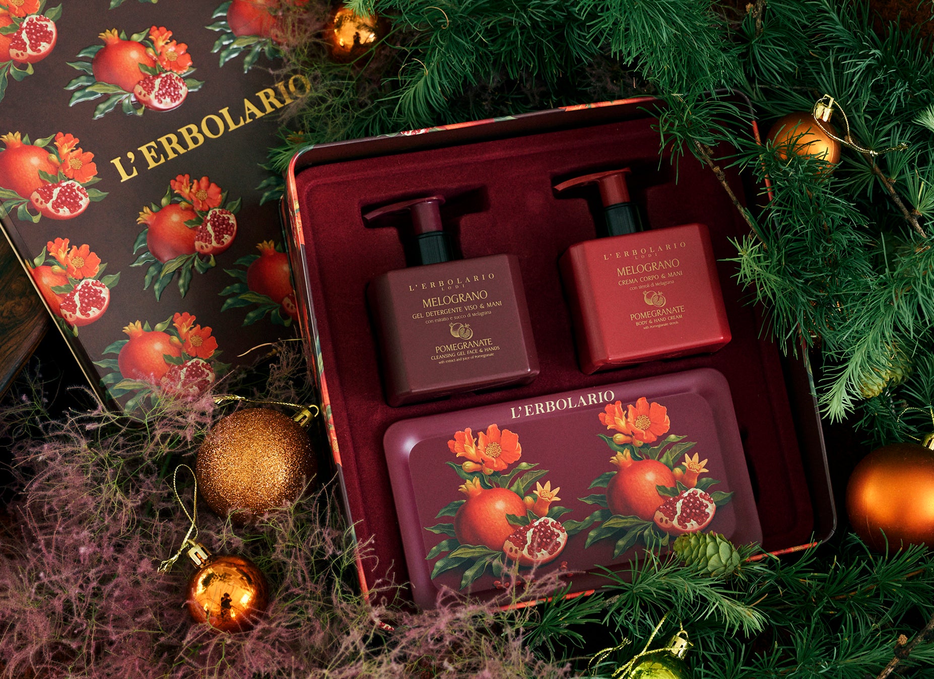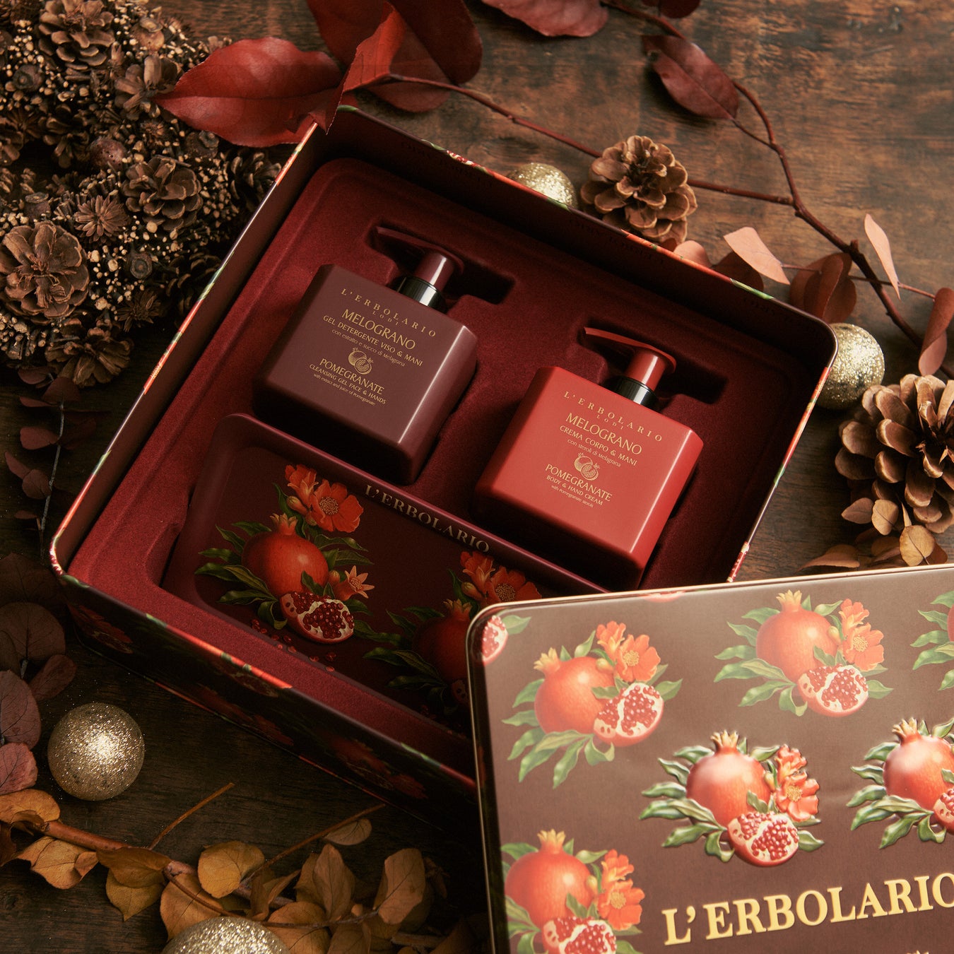 甘く温かで複雑なザクロの香りのハンド&フェイス用リキッドソープ、フルイド状のボディ&ハンドクリーム、美しいイラストをあしらったオリジナルトレイを、豪華な立体装飾をあしらった缶ボックスにセット。ボディケア2品は現品サイズなのでたっぷりお使いいただけます。