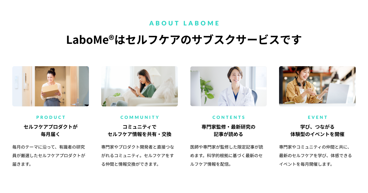 “Selfcare for Selflove”をビジョンに掲げ、自分らしい心とからだで生きるためのセルフケアの探索・共有をかなえるプロダクト&コミュニティサービスです。「LaboMe®」が考える6つの切り口、食~EatWell~、休息~MeTime~、美容~BeautyMe~、運動~BodyFlow~、温める~Warm~、つながり~ForUs~をテーマに厳選したセルフケアプロダクトが毎月届き、コミュニティでセルフケア情報を共有・交換することができます。