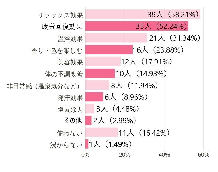 使う理由を聞いたところ、「リラックス効果」という意見が最も多く見られ6割弱という結果に。続いて疲労回復を求める声も過半数聞かれました。続いて3番目が温浴効果と続きます。