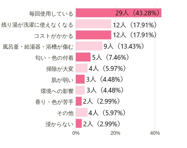 入浴剤を使用しないときの理由を聞いたところ、43%のかたは「毎回使用している」と回答しました。毎回使用しないというかたの理由として最も多かった意見が「残り湯が洗濯できなくなる」「コストがかかる」。これらの意見はどちらも節約志向の考えで、主婦の多くのかたが共感することと思います。更に3番目に多かった「風呂釜・給湯器・浴槽が傷む」という意見ですが、これも壊れた場合の修理等を考えると、ある意味コストに包括されるでしょう。