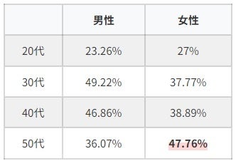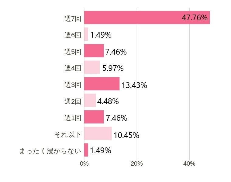調査によると、20代女性、30代、40代女性のうち毎日入浴の割合がそれぞれ、27%・37%・39%であるのに対し50代女性は47.76%ということで、年代ごとに毎日入浴の割合が増加していることがわかります。お子さんも巣立っていくころで、自由な時間が増えてくる年代ですので、お風呂にゆっくり浸かる時間が増えたというかたなども多いことと思います。