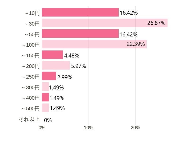 価格はその次となっていますが、一方で普段使いの価格帯を見ると、トップは~30円で、次に~100円の価格帯の割合が高くなっています。