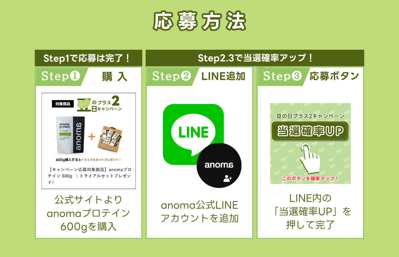 ・ anoma公式オンラインショップにて「 【キャンペーン応募対象商品】anomaプロテイン 600g 」を購入で応募は完了!