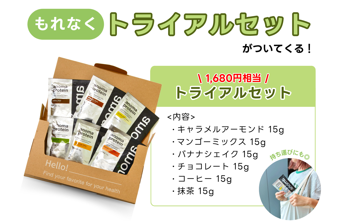 anomaプロテイン(600g)を購入された方全員に、通常1,680円(税込)で販売する持ち歩きに便利で6フレーバーお試しできる個包装セットをプレゼント!