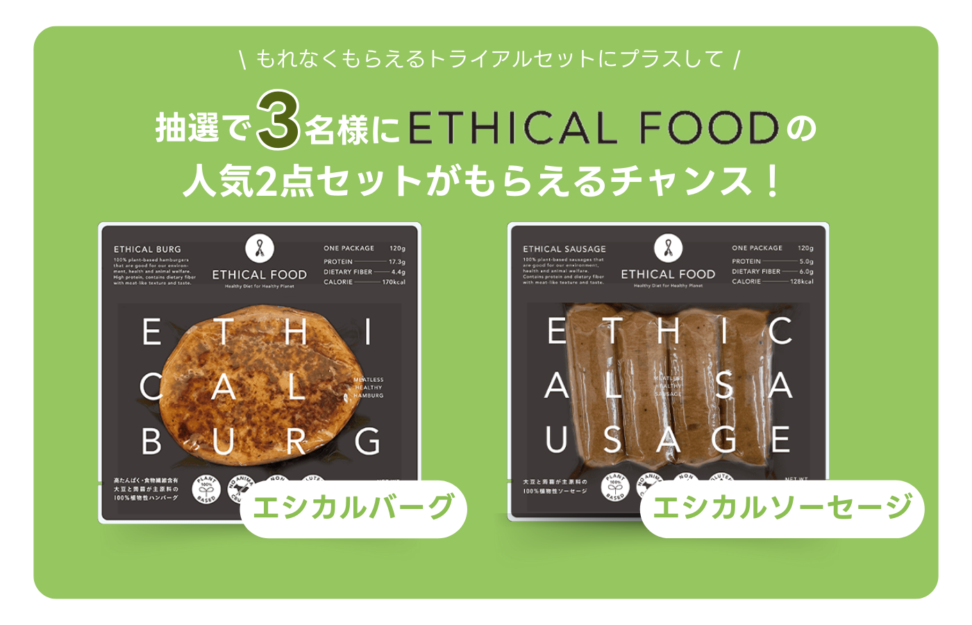キャンペーンに応募された方の内、抽選で3名様に100%植物性のエシカルバーグとエシカルソーセージをプレゼント!
