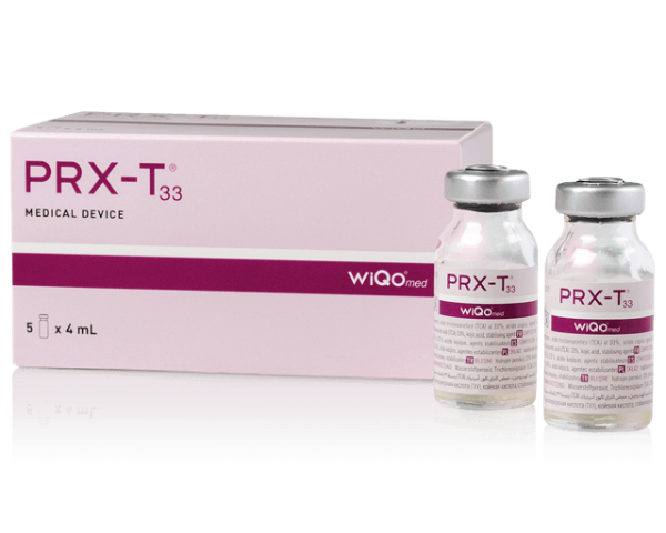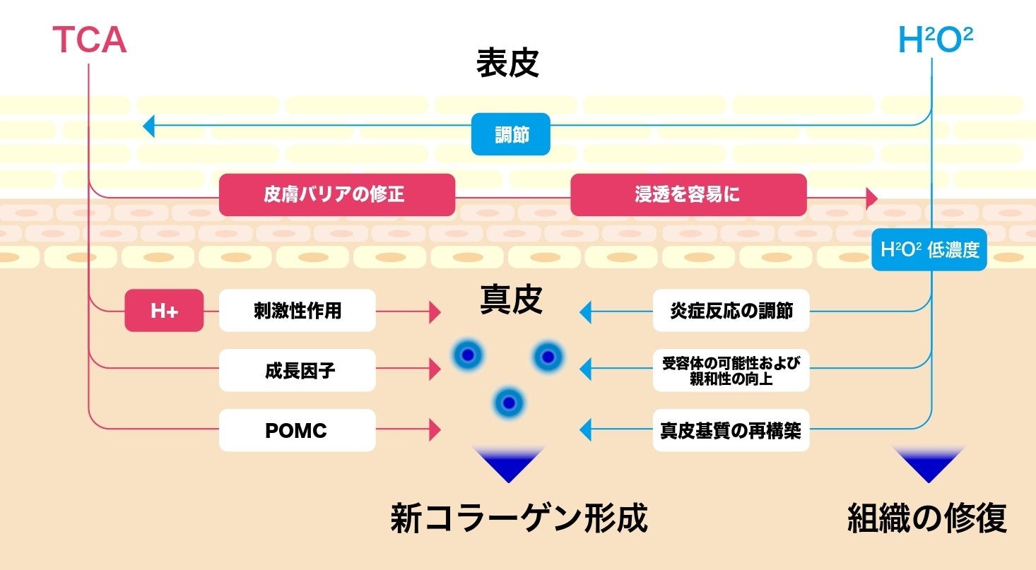 マッサージピールには「PRX-T33」という専用の薬剤を使用いたします。PRX-T33には高濃度トリクロロ酸(TCA)、低濃度過酸化水素(H2O2)、コウジ酸の3つの主成分が配合されています。H2O2の働きによって肌の表面が保護され、TCAが角質剥離を起こさずに真皮へ浸透し作用するのが特徴です。