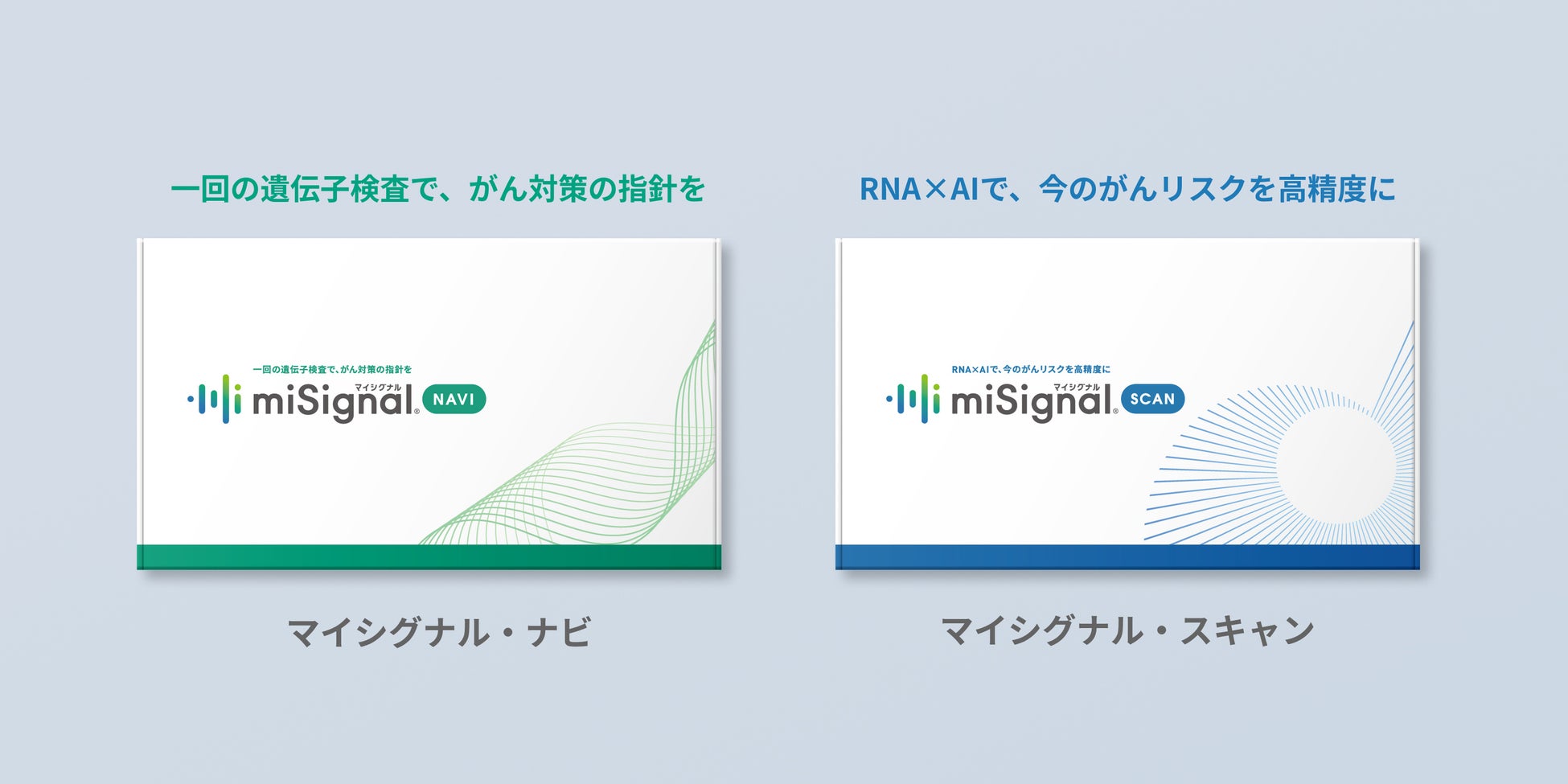 マイシグナル®︎シリーズは、RNA×AIで今のがんリスクを高精度に評価できる「マイシグナル・スキャン」と、一回の遺伝子検査でがん対策の指針を示す「マイシグナル・ナビ」を提供しています。本サービスでは、尿やだ液を採取するだけで、体に負担なく総合的ながん対策が可能です。まず自分の持って生まれた遺伝的リスク・生活習慣や環境リスクを「知る」ところから支援し、がんに対する正しい知識をもとに個々人のリスクに応じた予防のための行動変容を促すことで、がんを効果的に予防する取り組みをサポートします。そして、がんの「早期発見」をサポートすることで、生存率の上昇に貢献することを目指します。現在の対応がん種は、すい臓がん、大腸がん、胃がん、食道がん、肺がん、乳がん、卵巣がんの7種です。詳細はWebサイト(http://misignal.jp/)をご覧ください。