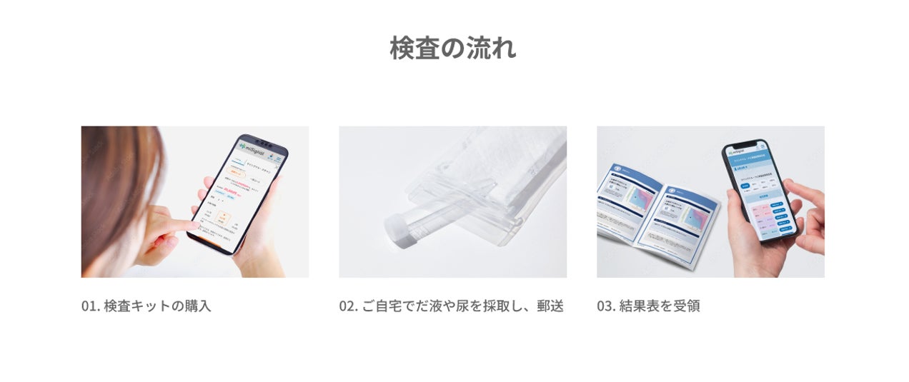 郵送にてご自宅に検査キットをお届けし、だ液や尿の採取を行っていただいたのち、弊社ラボへお送りいただきます。検体をお送りいただいてから、約30営業日で、検査結果報告書をご自宅またはオンラインにてお届けいたします。