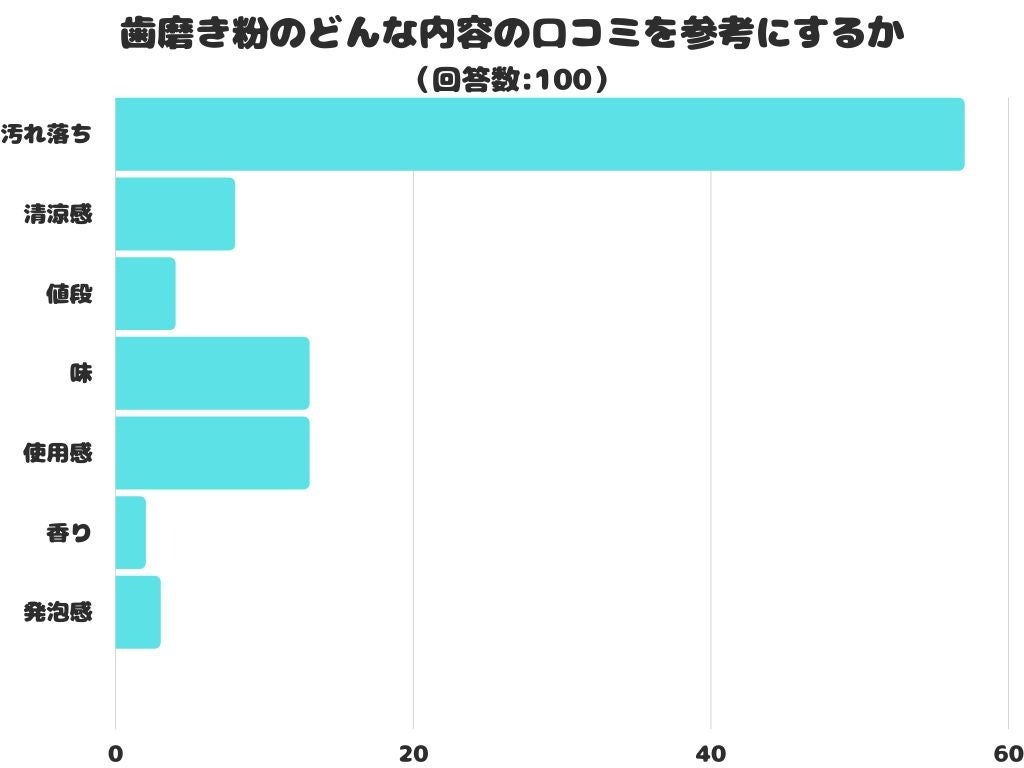 歯磨き粉のどんな内容の口コミを参考にするかをアンケートにて調査したところ、1位は「汚れ落ち」でした。