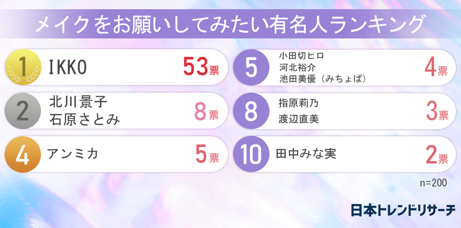 ということで今回は、医療アートメイクのメディカルブローと共同で、事前調査で「普段メイクをする」と回答した50代以下の女性200名を対象に、「メイクをお願いしてみたい有名人」についてアンケートを実施しました。