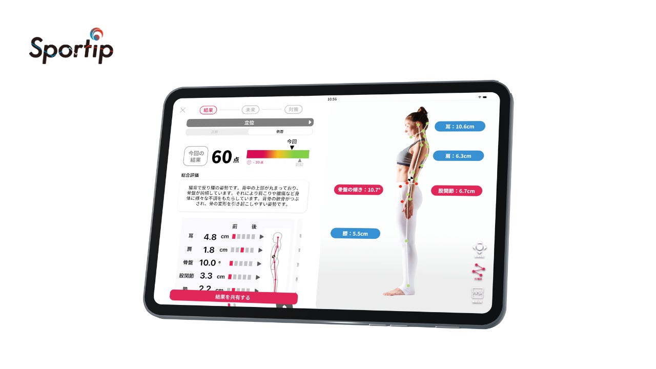 『Sportip Pro』は、ジム・整体/接骨院・デイサービス等のアセスメントをAIで効率化・高度化することで売上アップ・コストカットを支援するAIアプリです。スマートフォン・タブレットで撮影するだけで個人の身体情報を可視化し、適切な運動メニューをわずか ”1秒” のうちに提供可能です。4種の姿勢分析機能やROMテスト機能・歩行分析機能・ジャンプ計測機能など200を超える測定機能から、2000を超える運動メニューがクライアント様・会員様へぴったりな形で自動提案されます。