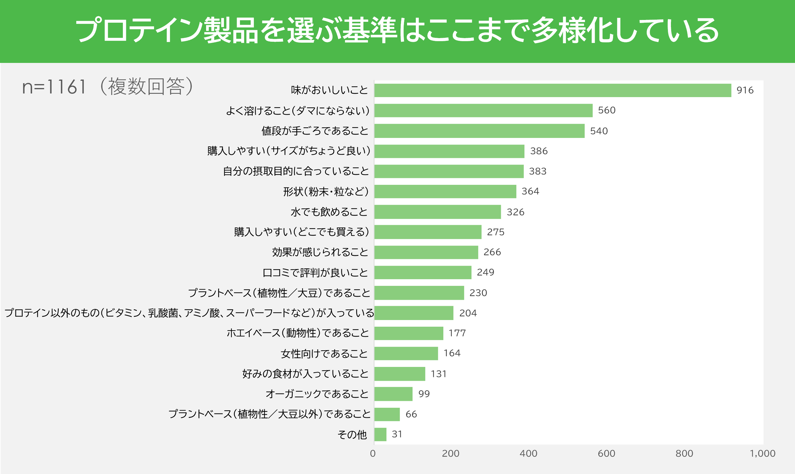 日常的に摂取したいプロテインサプリメントへの期待値も、最近の市場変化に伴って変わってきています。例えば、「プロテインサプリメントを選ぶ際の基準」として、変化を感じること以上に、美味しさや使いやすさ、価格などが重要視されています。また、市場調査からは、プロテイン製品の原料に対する意識の変化も見られました。植物性  (プラントベース)プロテインやオーガニック製品への期待値が高まる可能性があり、今後はこうしたプロテイン商品が新たなメインストリームとして成長することが予想されます。