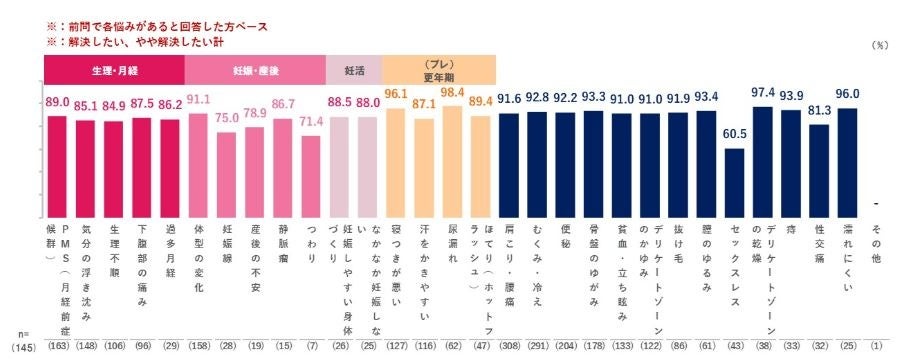 2023年に行われたフェムテックに対する理解・意識に関する調査では、約8割の女性が何らかの悩みを持っていることが明らかになりました。特に「肩こり・腰痛」「むくみ・冷え」は3割を超え、「PMS」「気分の浮き沈み」「体型の変化」「便秘」「骨盤のゆがみ」も約2割の方が悩みを抱えていました。解決したい悩みで上位に上がったのが、「尿漏れ」「デリケートゾーンの乾燥」「寝つきが悪い」「濡れにくい」は9割半ばを超えていました。(画像引用:日本インフォメーション株式会社 フェムテックに関する意識・行動調査)