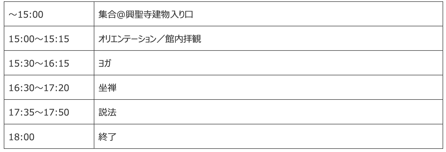 セッションは心身のバランスと深い内観を促進します。自身の内側と向き合い、深いリラクゼーションと自己探求の旅に誘われるこのセッションで、日常生活に新たな気付きとバランスをもたらしてください。ヨガを体験することで、後に続く坐禅の時間がより集中しやすく、心が静かに落ち着く瞑想が深まります。この特別な坐禅への準備段階をお楽しみください。