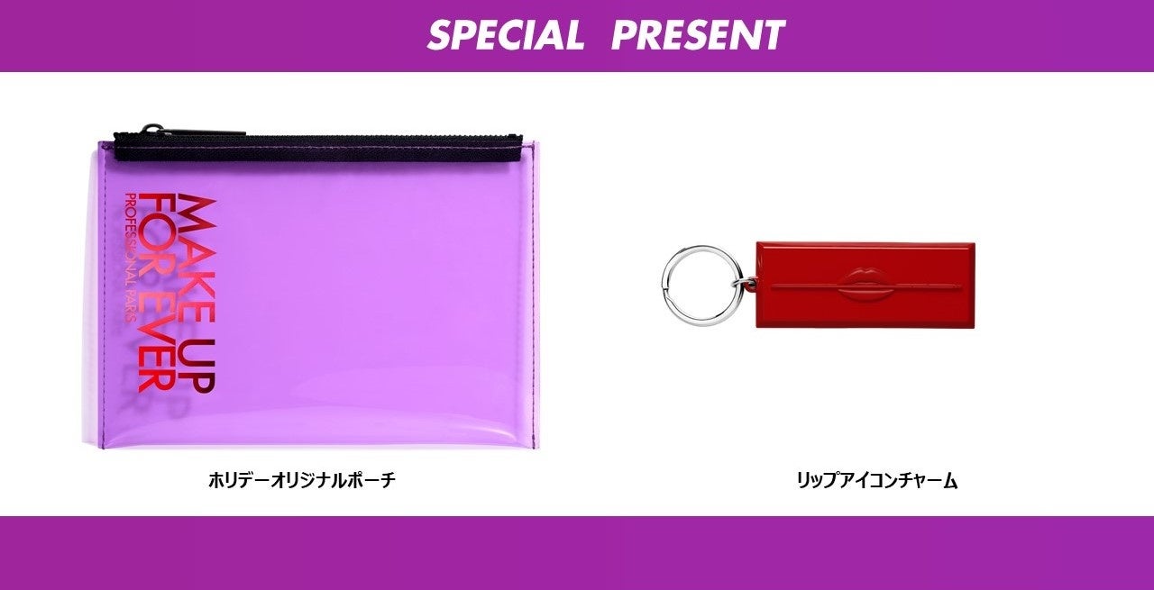 11月1日(水)より全国のメイクアップフォーエバー直営店および百貨店カウンターにて税込9,900円以上製品をお買い上げの方にホリデーオリジナルポーチをプレゼント!さらに税込11,000円以上お買い上げの方にリップアイコンのチャームもプレゼントいたします。※数量限定