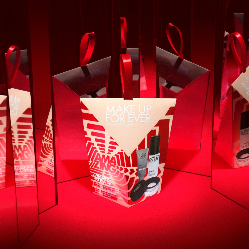 メイクアップフォーエバーのベストセラーアイテムであるフェイスパウダーとフィックスミストのトラベルサイズ、毛穴や小じわをカバーするメイク下地のデラックスサイズがセットとなったミニキット。