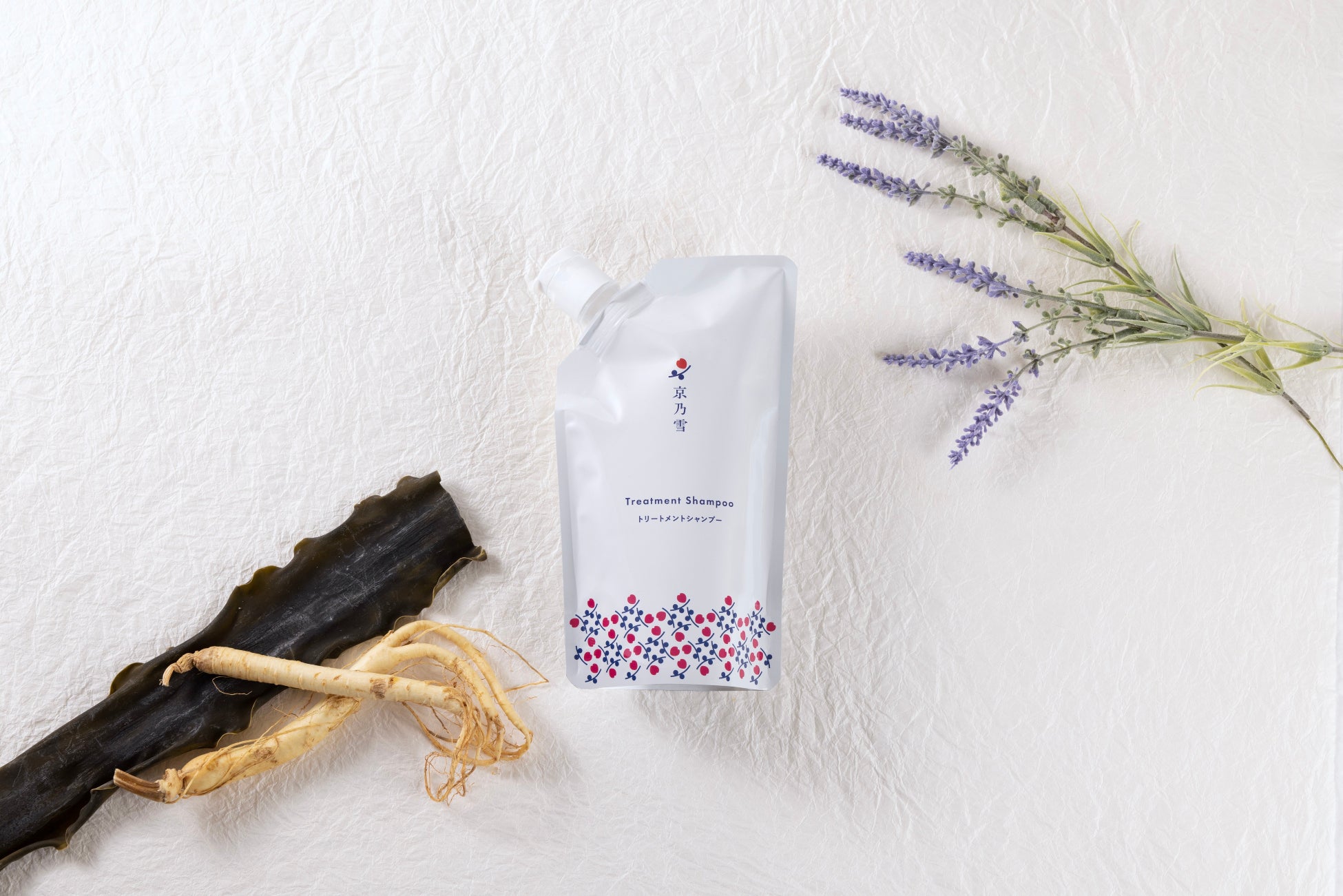 京乃雪トリートメントシャンプーは、27種類の国産和漢植物エキスに加え、高麗人参エキス、ミツイシコンブエキス、サクラエキスなどの天然素材を配合。地肌にも和漢植物エキスの美容保湿効果を感じていただける処方となっています。またご愛用者様より「美容院で髪を褒められた」「少しボリュームアップした気がする(※トリートメント効果による)」「主人も使いはじめ、夫婦で愛用しています」といったお声を頂戴しています。