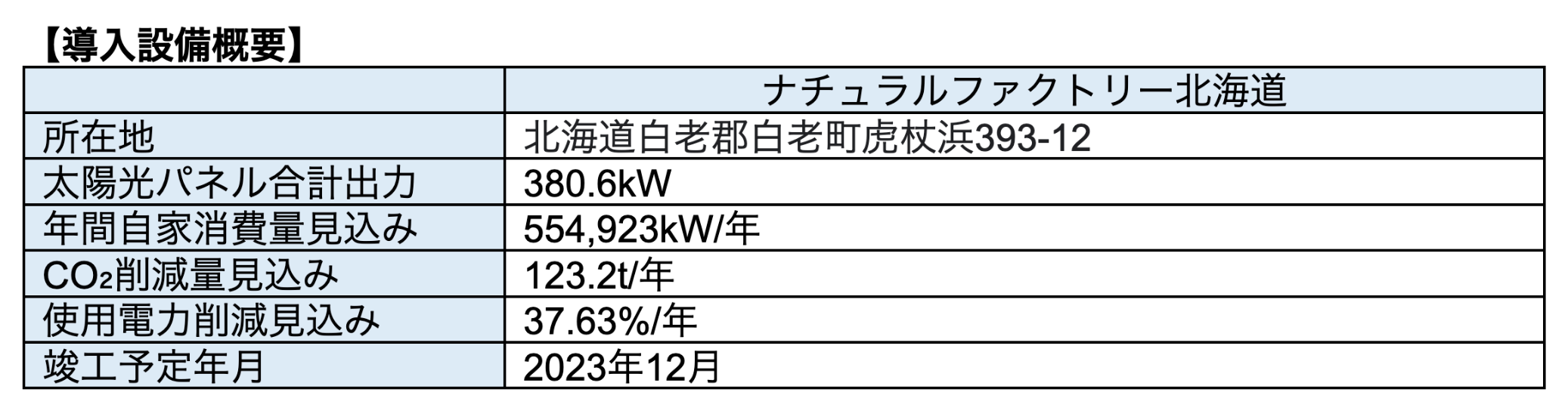 株式会社H.E エナジー(本社:北海道札幌市、代表取締役社長:瀬尾 浩史、以下、「当社」)は、株式会社ナチュラルサイエンス様(本社:東京都江東区、代表取締役社長:小松 令以子、以下「ナチュラルサイエンス」)が運営するスキンケア工園「ナチュの森」内のスキンケア製品製造工場であるナチュラルファクトリー北海道(白老郡白老町)へ、自家消費型太陽光発電設備導入決定したことをお知らせ致します。