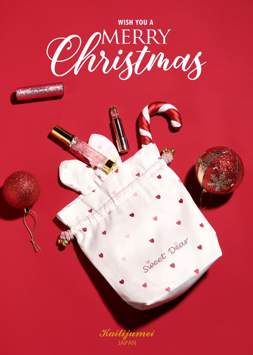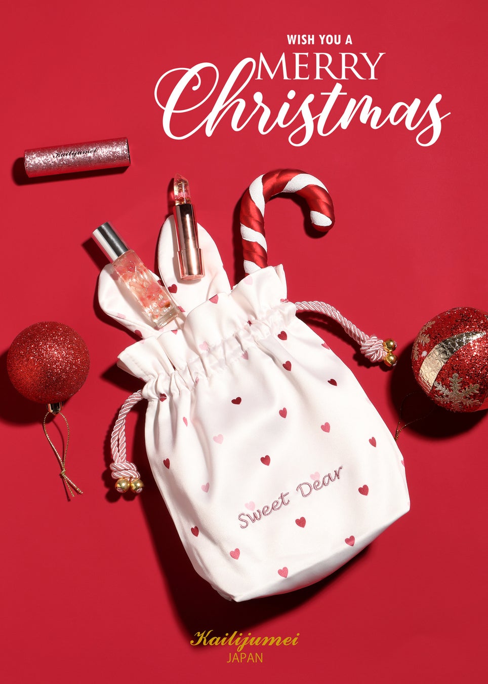 Kailijumei(カイリジュメイ)の2023年のクリスマスコフレは、ハリと光沢のある生地にハート柄をあしらった、耳と尻尾が可愛いバニーポーチにベストセラーリップと新商品を詰め込んだ限定セット。
