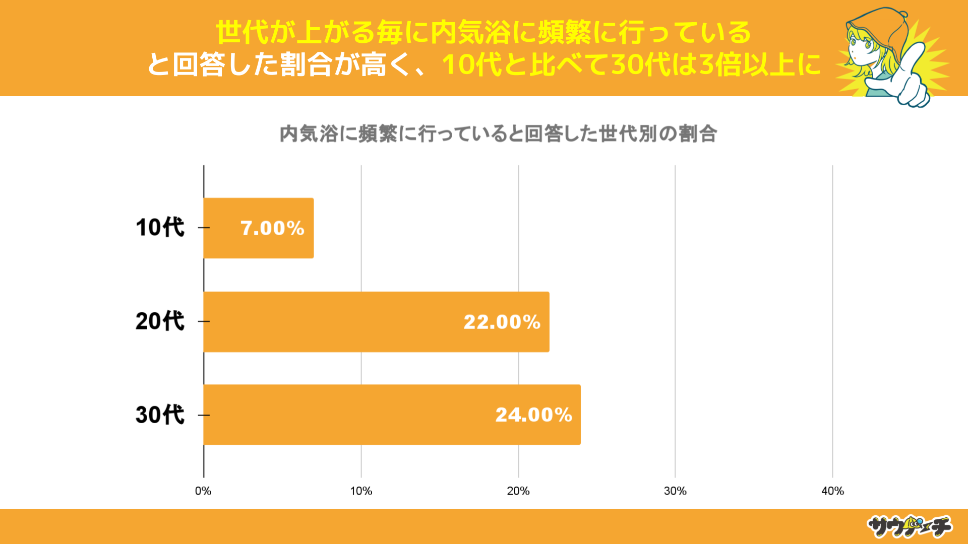 内気浴に頻繁に行っていると回答した割合を世代別でみてみますと、30代の24%が最も高く、次いで20代の22%、10代の7%と、世代が上がるほど割合が高くなり、10代と比べて30代は3倍以上高い結果となりました。