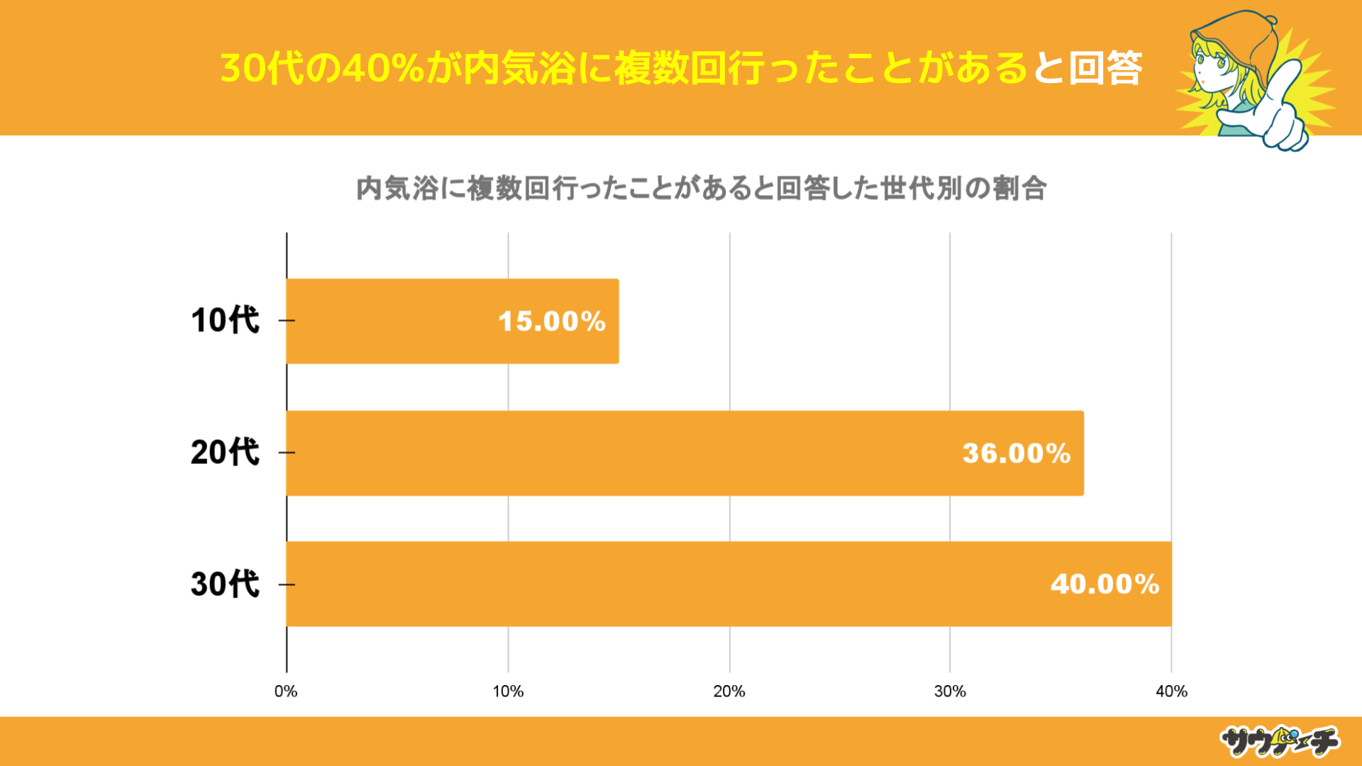 また、「内気浴に複数回行ったことがある」と回答した割合を世代別で比較すると、30代の4割が複数回行っていることがわかりました。