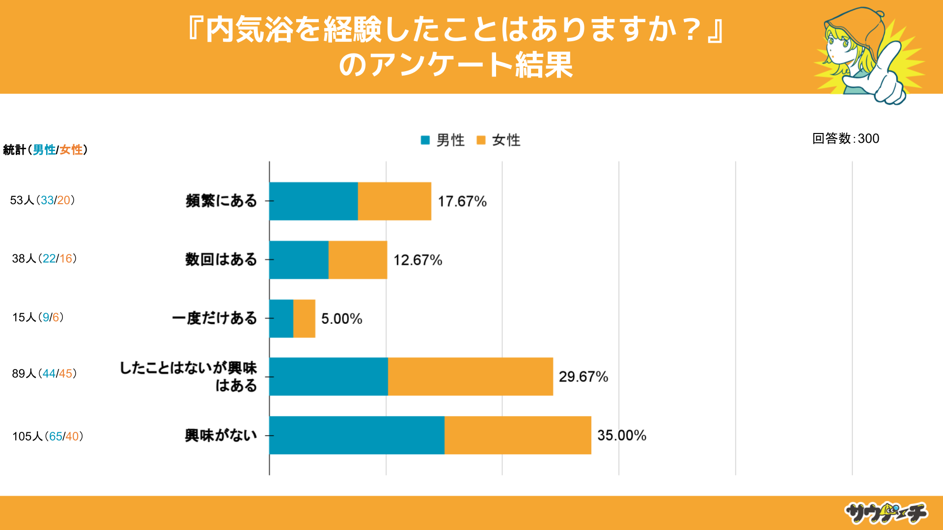 10代〜30代男女を対象とした「内気浴を経験したことはありますか?」というアンケートで最も多かった回答は「興味がない」で35%でした。