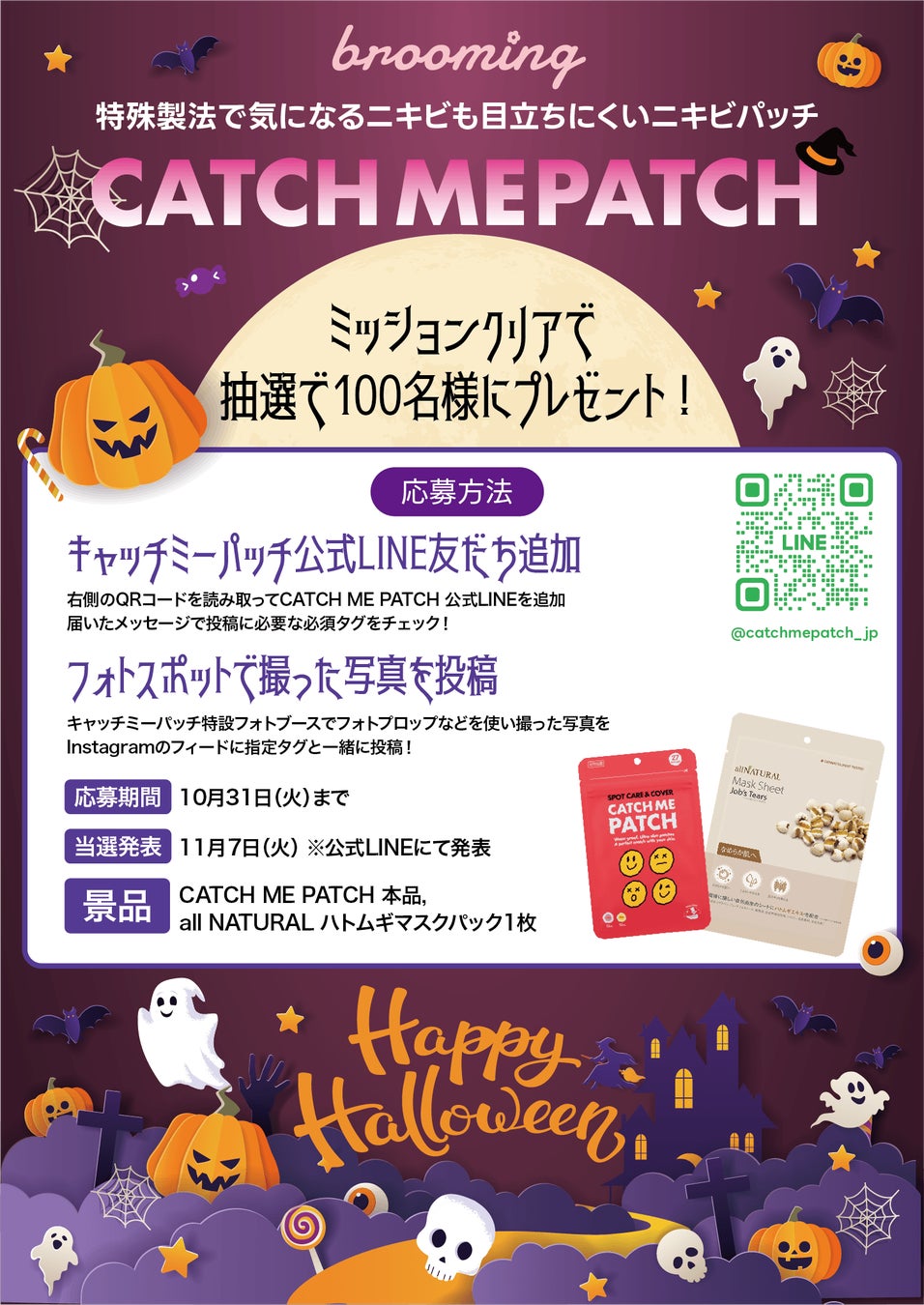 10⽉末のハロウィンシーズンに合わせ、brooming店舗をご訪問頂くお客様への⽇頃の感謝を還元するキャンペーンとして、韓国で大人気のニキビパッチ「キャッチミーパッチ」の特別サンプルのプレゼントを実施します!