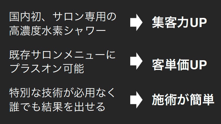 サロン専用・高濃度水素発生シャワー「H2 ONEST DETOSPA(エイチツー オネスト デトスパ)」は、お客様の満足とサロンの新たな付加価値、その両方を生み出し、サロンの集客・収益UPに貢献します。