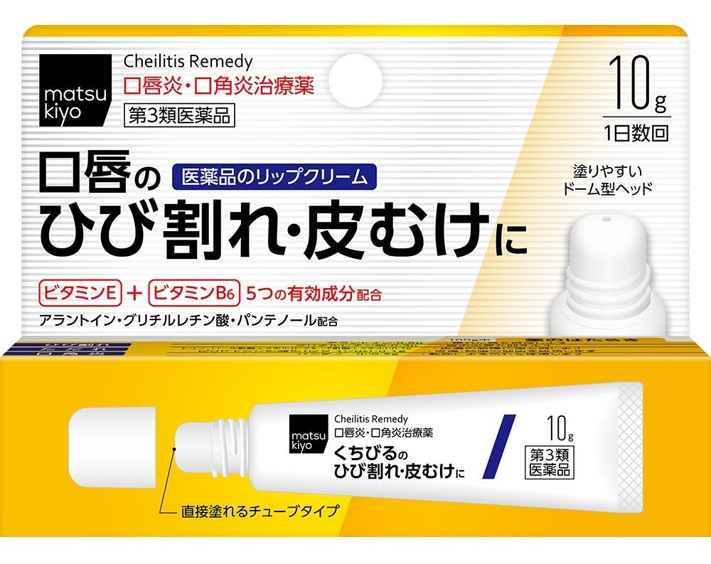 刺激となるメントールは無配合で、アラントイン(組織修復)、グリチルレチン酸(抗炎症)、トコフェロール酢酸エステル(血行促進、症状の回復促進)、ピリドキシン塩酸塩(新陳代謝の促進)、パンテノール(組織修復)の5つの有効成分に加えてワセリンを配合したリップです。口唇に塗りやすいドーム型ヘッドを採用しました。