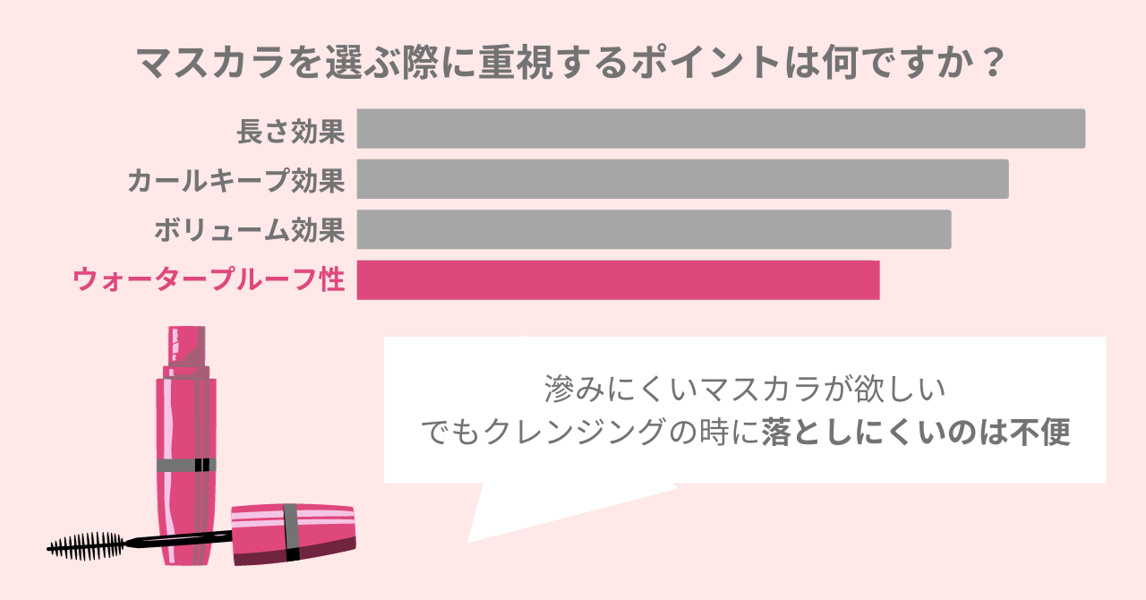 長さやボリュームを出すだけでなく、滲みにくくパンダ目にならないマスカラが人気です。しかし、調査の結果、水や汗に強いマスカラは、「クレンジングの際になかなか落ちない」という悩みをかかえる女性がいらっしゃいました。